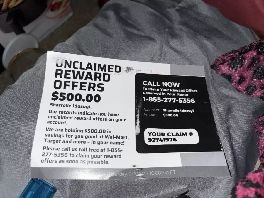 "We are holding $500.00 in savings for you good at Wal-mart, Target and more- in your name!
