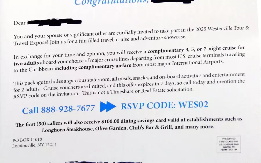Declares not a Timeshare or Real Estate solicitation. Suspect want to get to join some kind of travel club with dues. Uses logos for 3 major cruise lines and a major hotel, and small print says not affiliated with any of them.