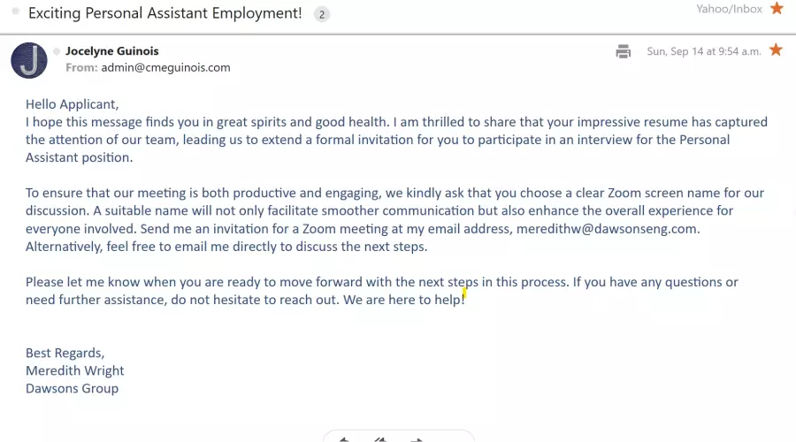 I hope this message finds you in great spirits and good health. I am thrilled to share that your impressive resume has captured the attention of our team, leading us to extend a formal invitation for you to participate in an interview for the Personal Assistant position.