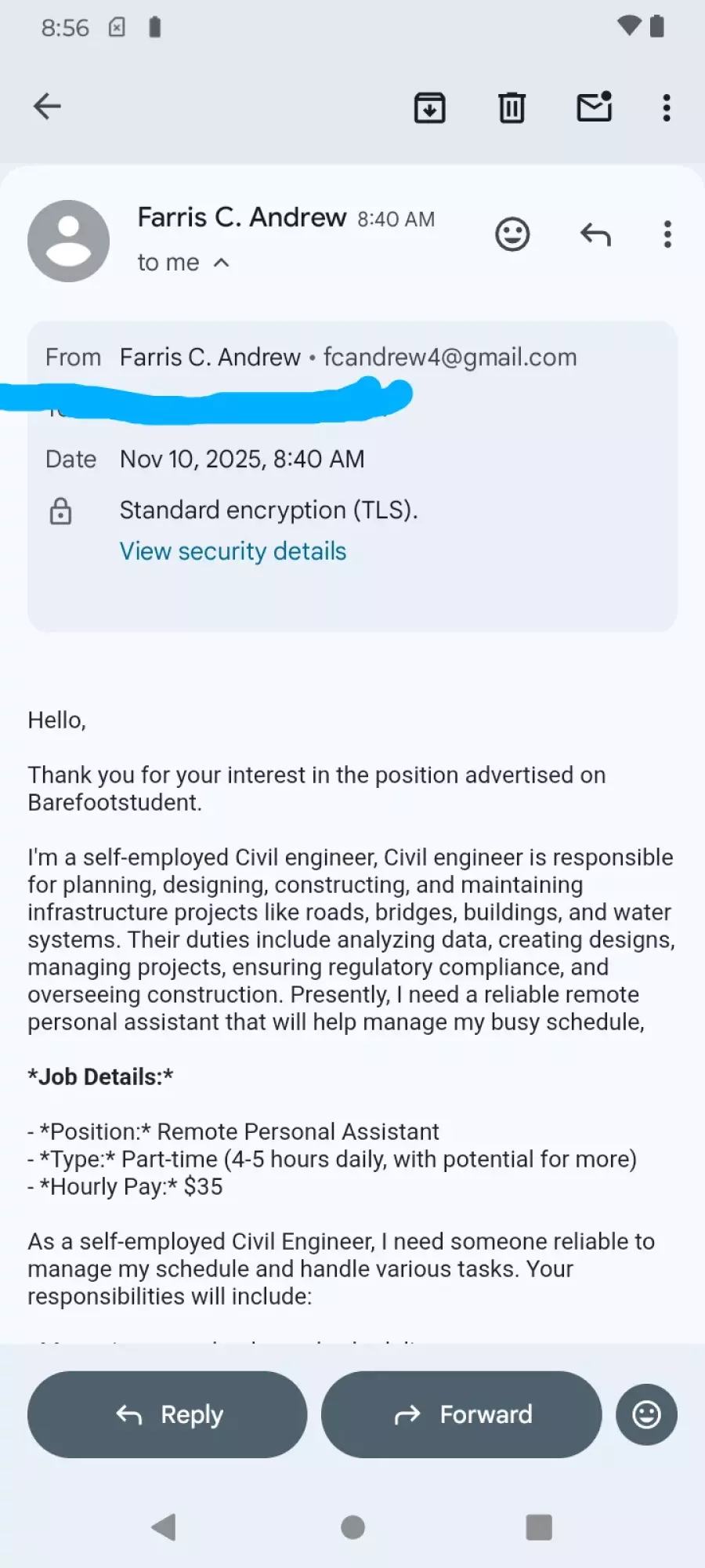 Thanks for responding to the job post advert on CareerBuilder. I want to believe and hope I am dealing with an honest person because I usually would not hire anyone this way but I urgently need the services of a Personal Assistant due to my very busy schedules.