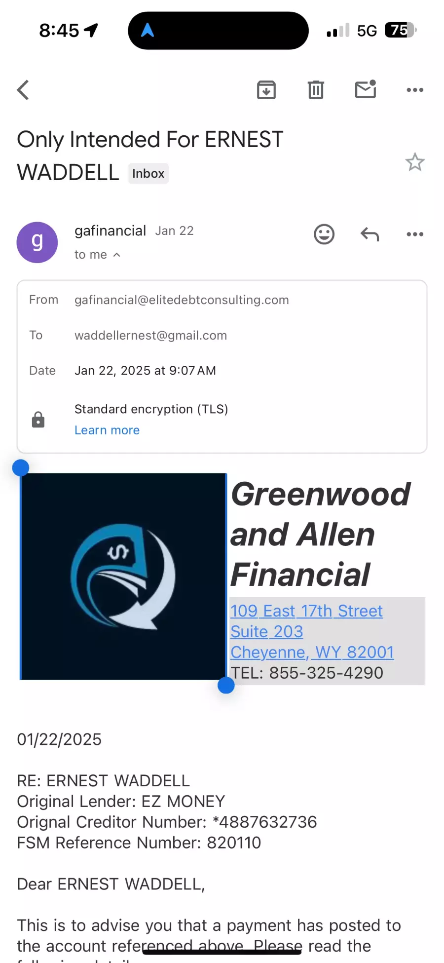 I also not only emailed EZ loans but Consumer Financial Protection Bureau. We're on one income at the moment because my husband is fighting for his disability and to get his back surgery and we're struggling financially. I can't afford to lose my disability or go to court over something like this. I don't ever remember using or getting a loan through EZ loan and I kept arguing with them over this, but I have been forced to make payments on this settlement of $75/mo for 18 months. I have no way to prove this and I have no money to have a PI investigate this either. I have done searches on the internet via court house records online and via Credit Karma and Credit Sesame and my credit reports don't show any such thing, nor is there any court records. Greenwood Allen is a legit company. The person I spoke to was a Mr. Otto. I can't afford the added stress as I have CDK, COPD and a heart condition.