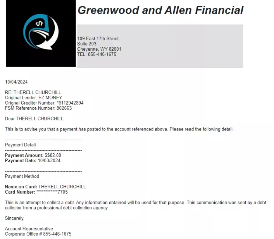 They sent an email with the same headliner of the Greenwood And Allen Debt Collections. I Googled the name and this website came up. At first I thought maybe somebody stole my identity so I contacted ACE Payday loan directly and they stated they have nothing with my information in there system AT ALL, not even an account that fell into default. These people obviously got information off the dark web of our common information and using it against us to scare us into making a payment immediately for something we never did.