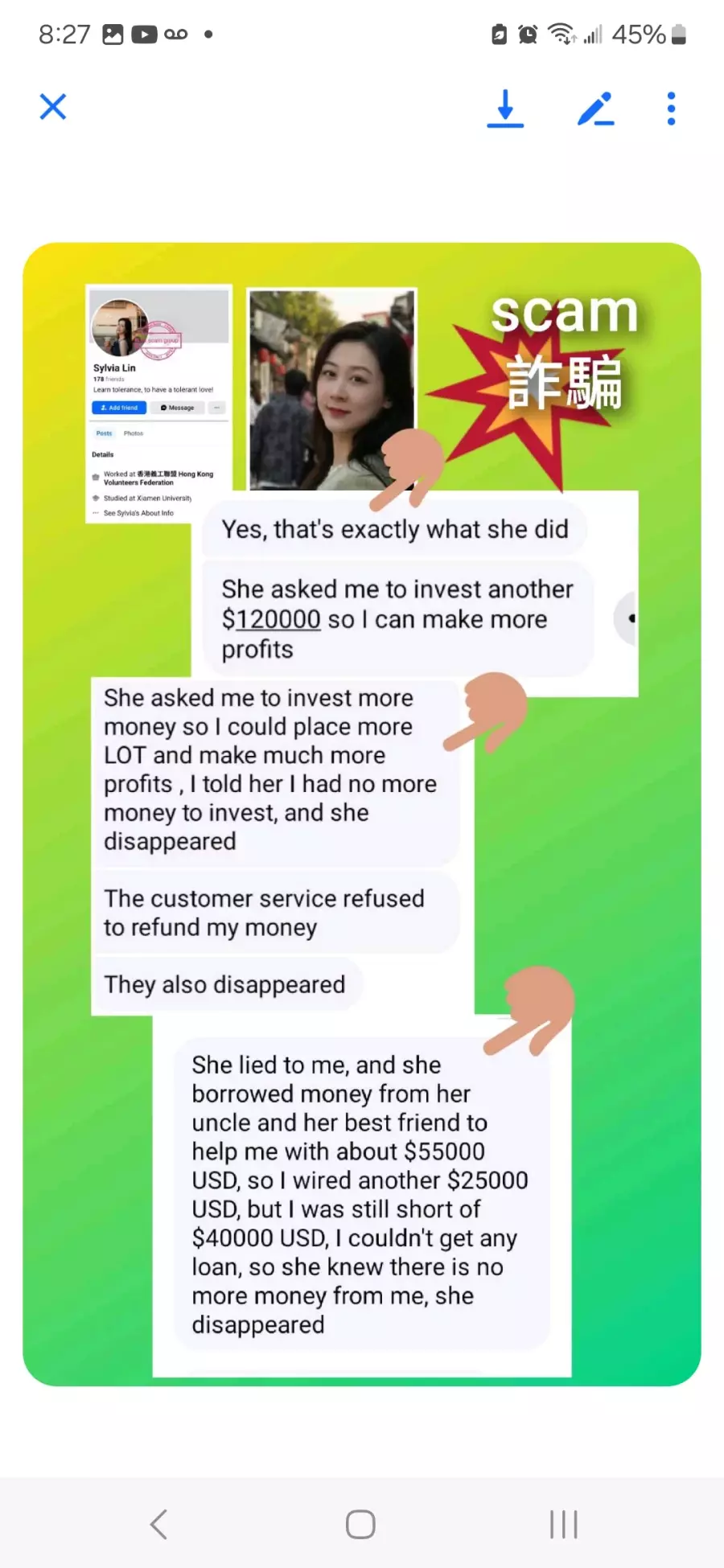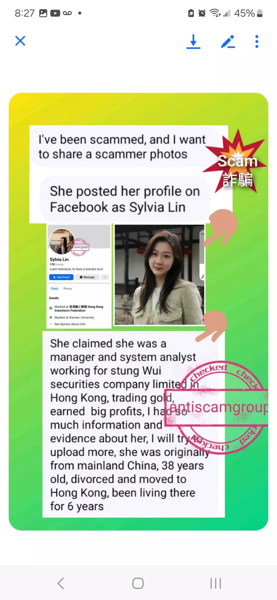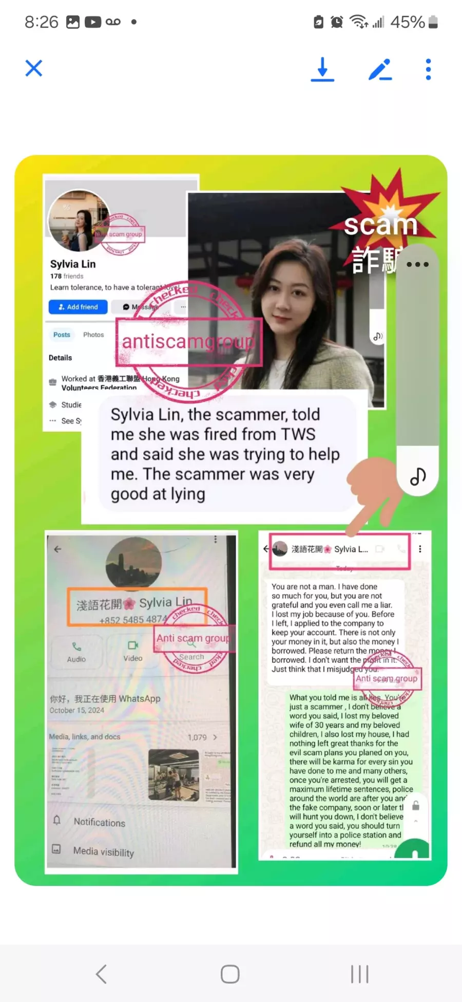 Sylvia Lin account number was ******, her password was ********, she gave me her account and password when she trained me how to trade, try logging, check out the history in yhe trade, she told me she was fired from the company of TWS, which she was lying, she currently continues to scam other people on Facebook. Please helo to stoo her.