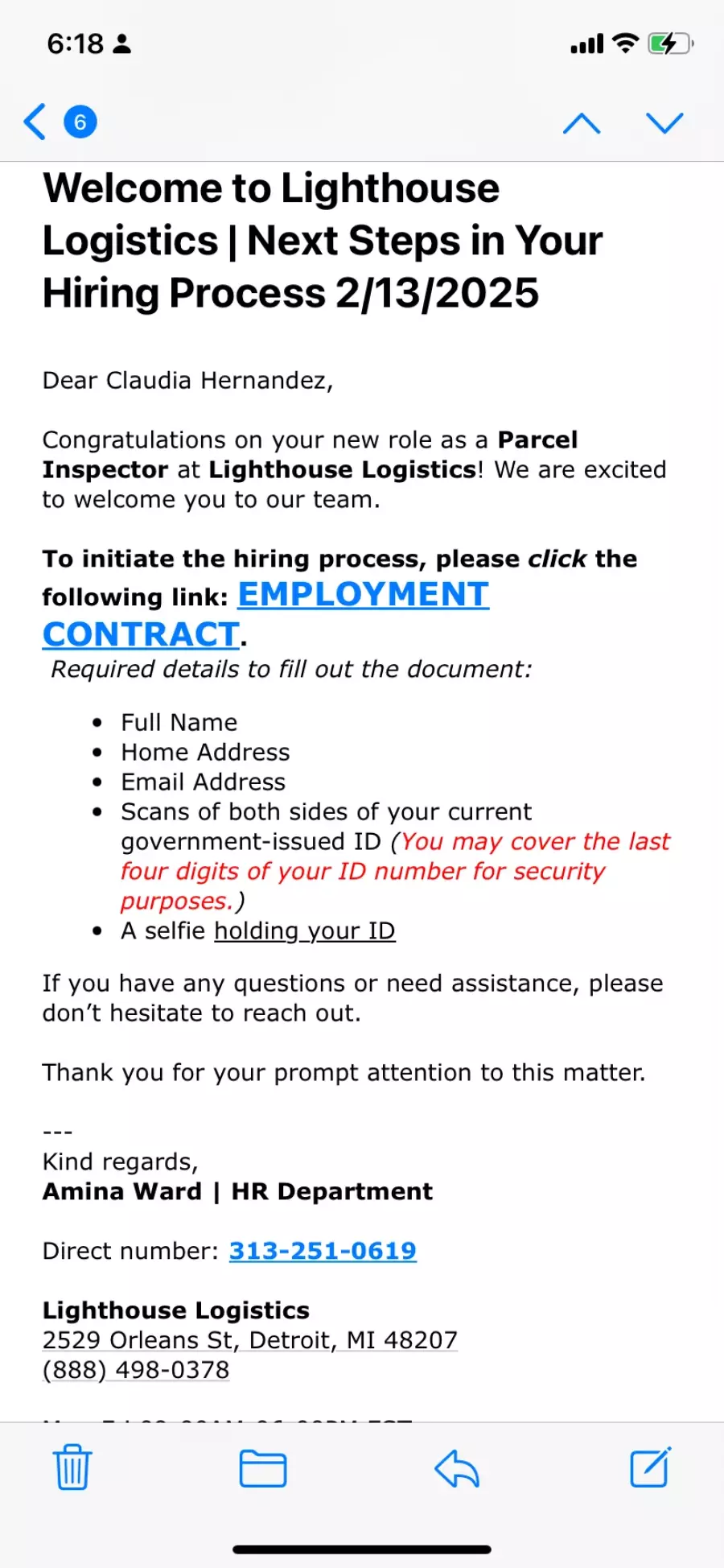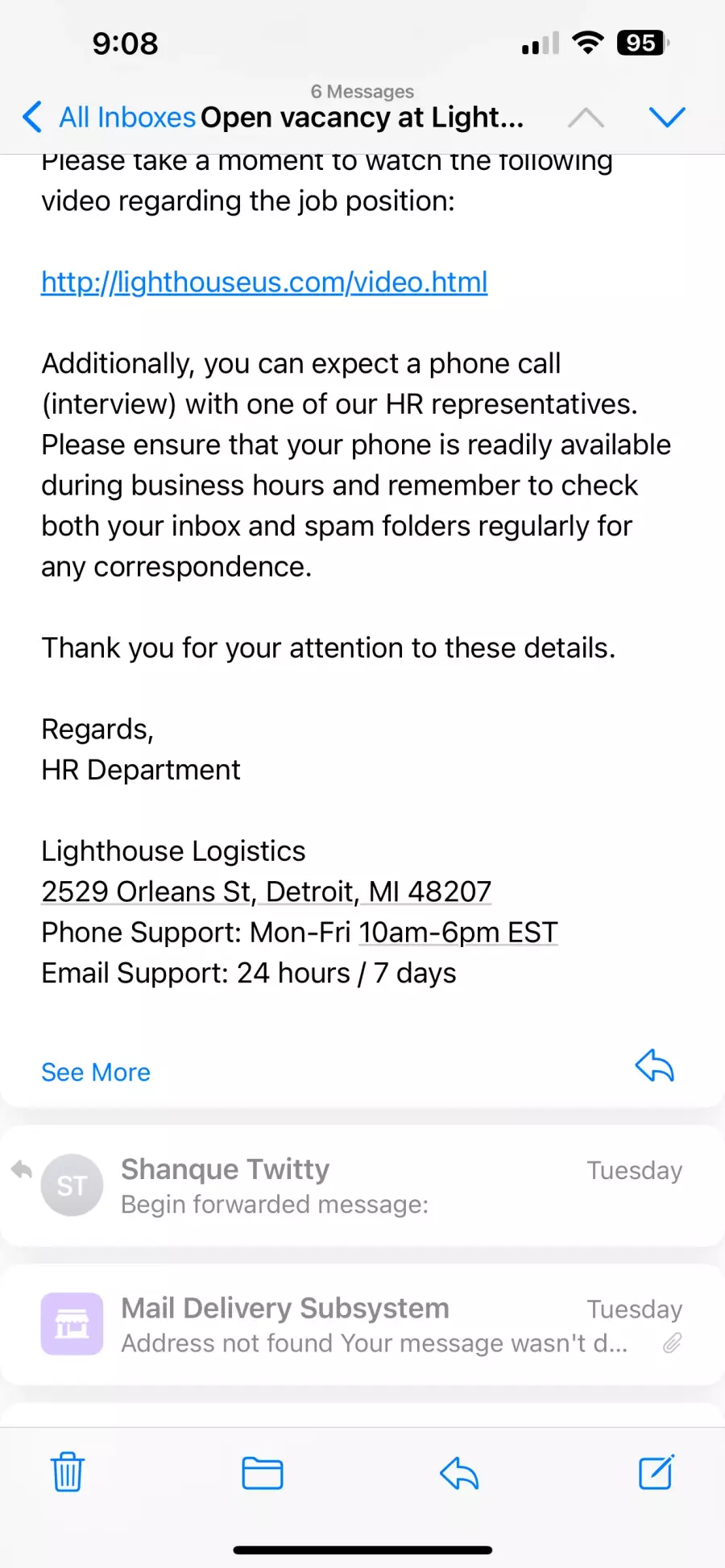 I then told her that I did not apply for this job and would not be clicking any links. She told me that they actually were sent my resume by Indeed instead of myself applying for it like she originally said. I challenged this reminding her she said I applied specifically. She then quickly told me she was sending an email with legal documents and links to their website to verify the company legitimacy and then immediately hung up. She did send said email but I did not bother clicking on any links or attachments provided.