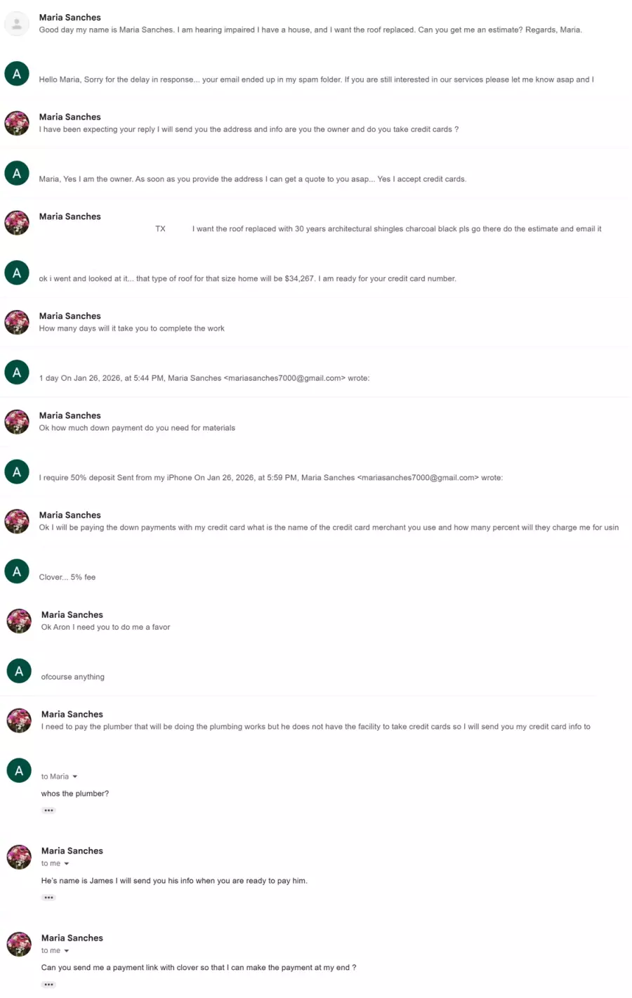 I wrote back to her telling her I would need proof of ownership and 50% deposit, to which they were happy to pay with a card, but asked about the fees we charge. I said we have no fees, but because a past dispute occurred where someone reported their roof payment as fraud and the card company reversed the transaction, I told "her" that we would require the payment in the form of a cashiers check or money order and we would need proof of home ownership before moving forward and that was the last I heard from them. I decided to Google search the email and found this amazing thread.