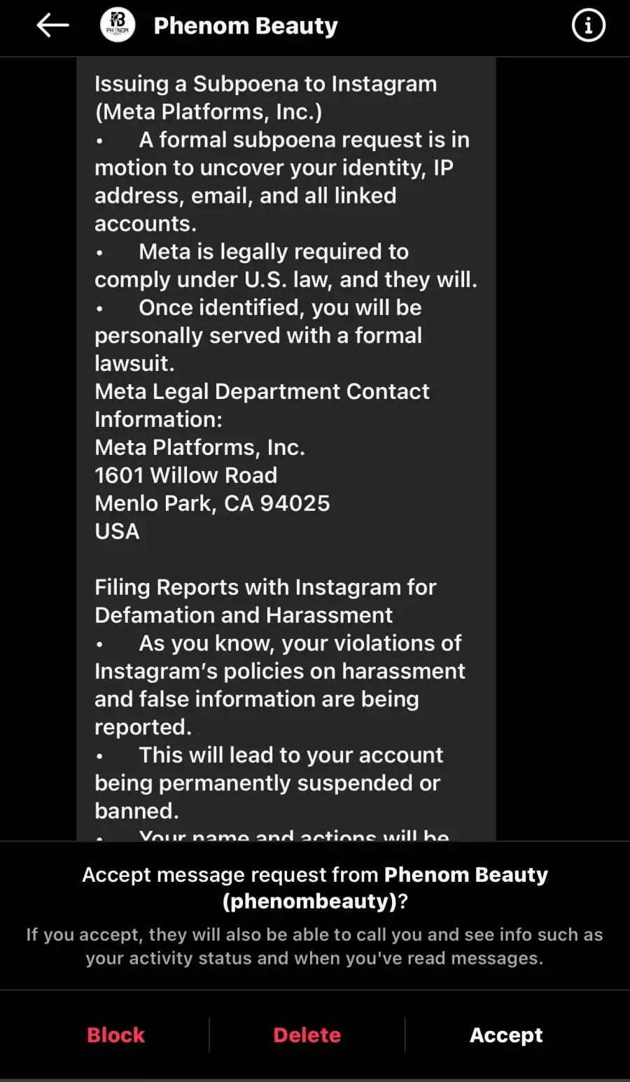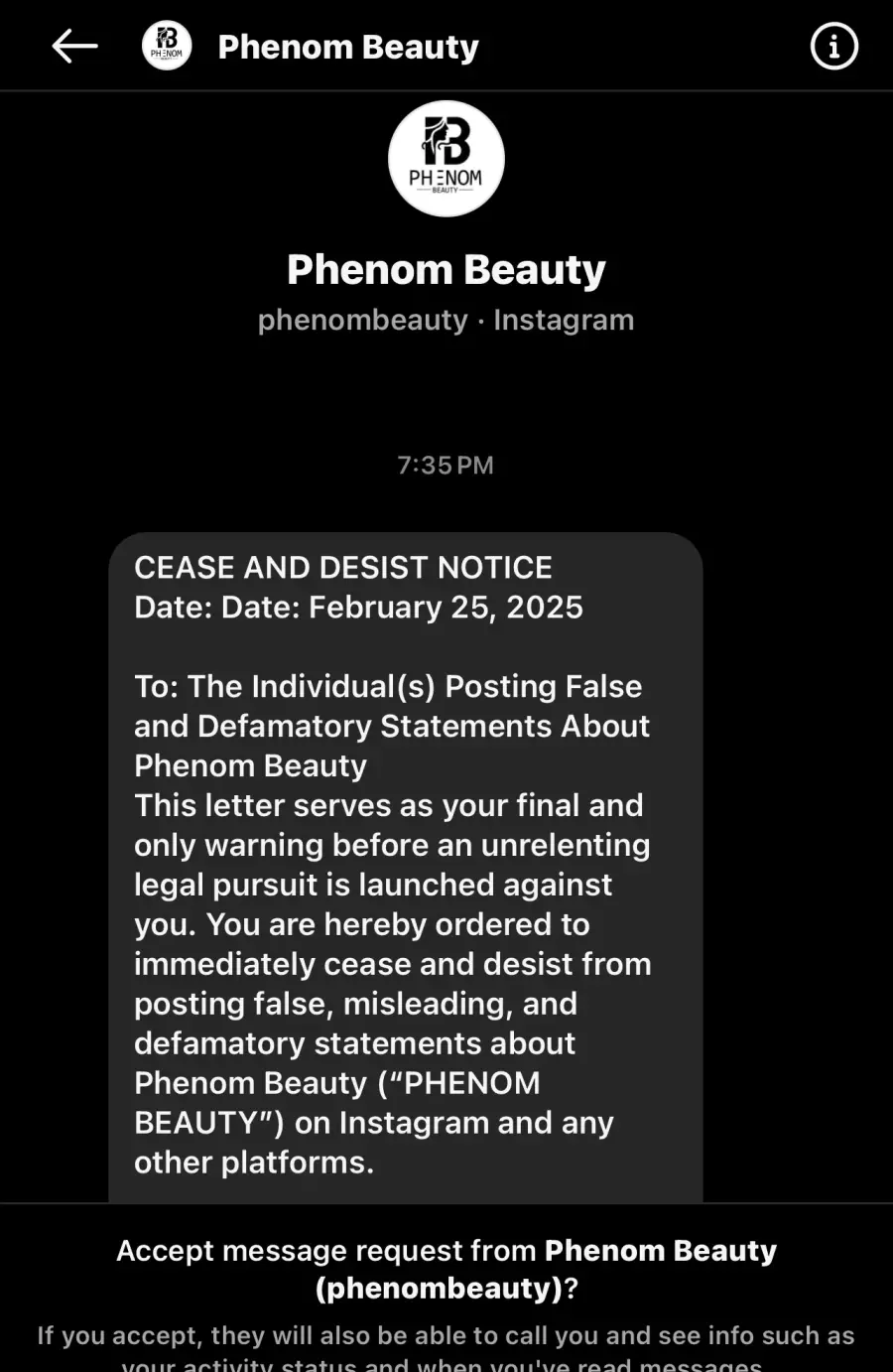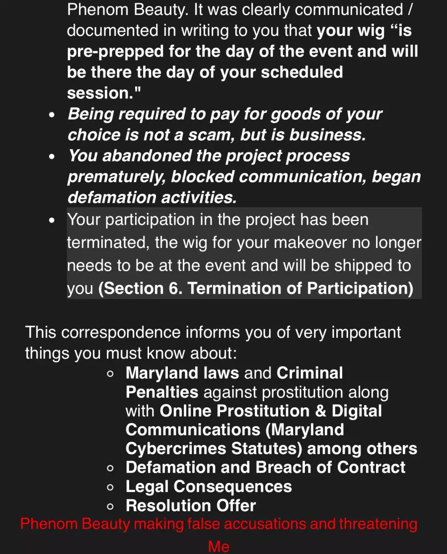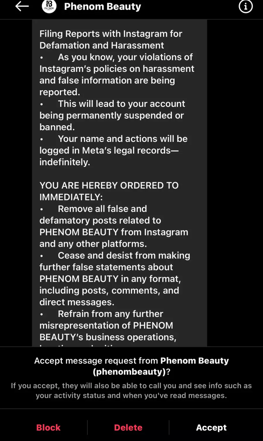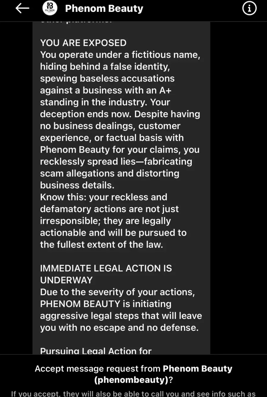 “This is your FINAL WARNING. If you fail to comply within 24 hours, PHENOM BEAUTY will pursue swift and aggressive legal action. This matter will become public record, which will permanently impact your reputation, finances, and future opportunities.