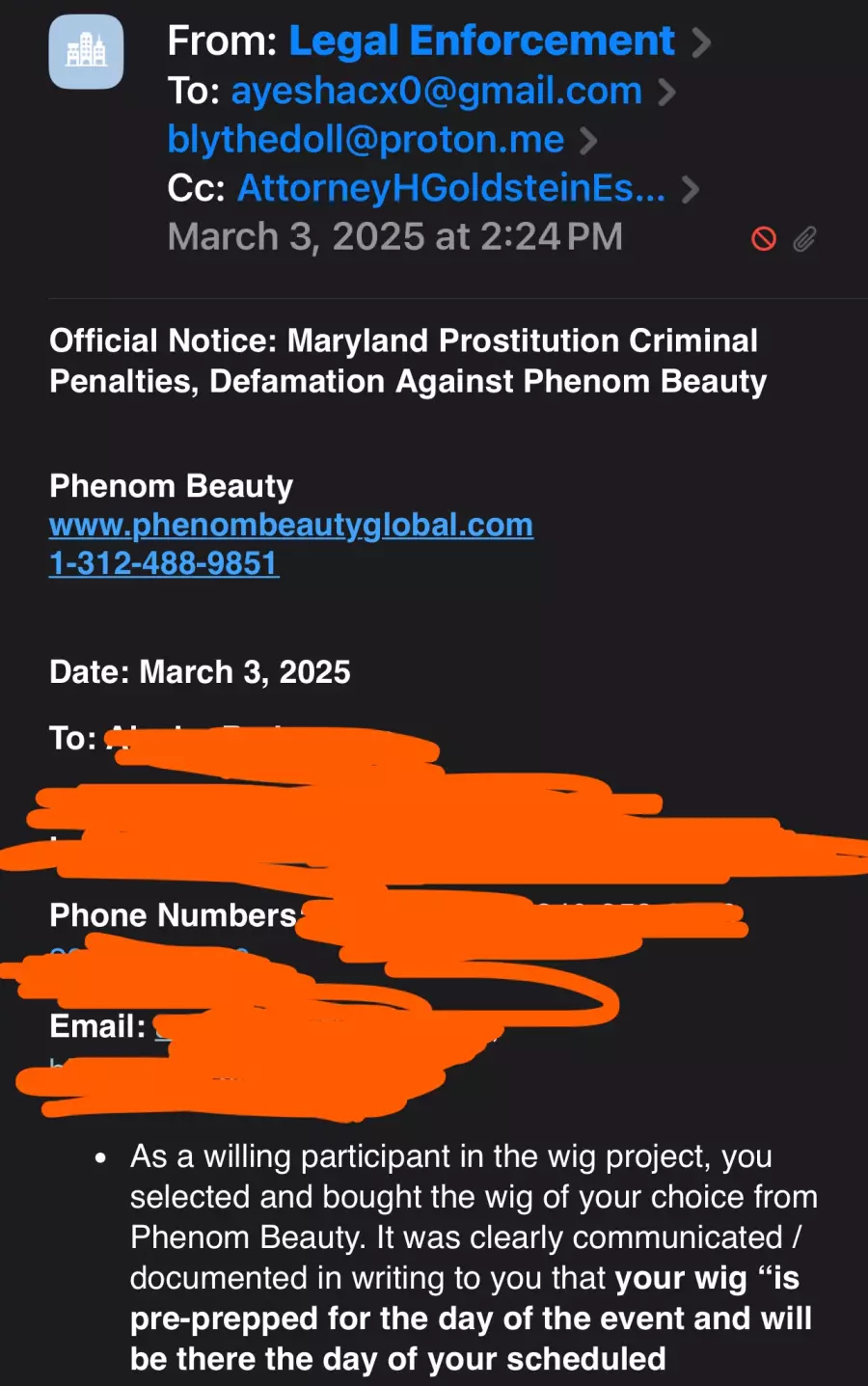 Phenom Beauty Legal Enforcement Division“ and even falsely impersonated the law offices of Attorney Howard Goldstein in riverside California. I contacted the real law offices of Howard Goldstein and they assured me they are not representing this person, nor would they ever attach explicit photos of someone in an email to try and shame them and sextort them.