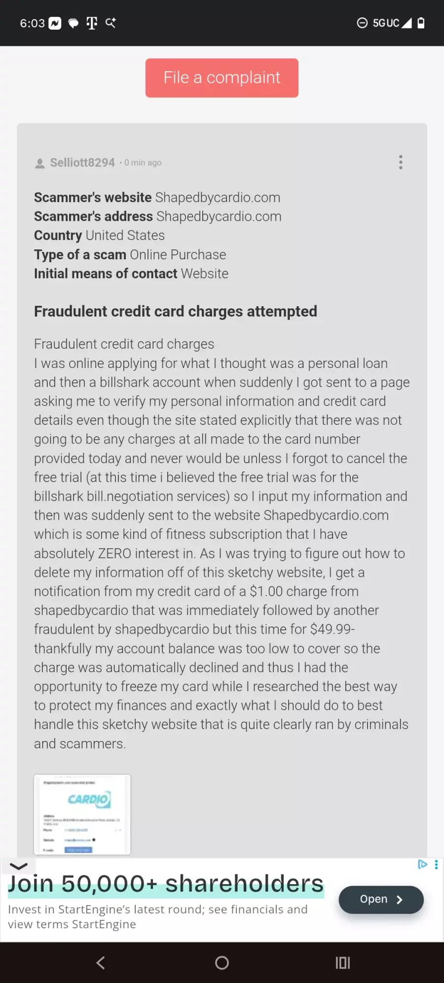 I was online applying for what I thought was a personal loan and then a billshark account when suddenly I got sent to a page asking me to verify my personal information and credit card details even though the site stated explicitly that there was not going to be any charges at all made to the card number provided today and never would be unless I forgot to cancel the free trial (at this time i believed the free trial was for the billshark bill.negotiation services) so I input my information and then was suddenly sent to the website Shapedbycardio.com which is some kind of fitness subscription that I have absolutely ZERO interest in. As I was trying to figure out how to delete my information off of this sketchy website, I get a notification from my credit card of a $1.00 charge from shapedbycardio that was immediately followed by another fraudulent by shapedbycardio but this time for $49.99- thankfully my account balance was too low to cover so the charge was automatically declined and thus I had the opportunity to freeze my card while I researched the best way to protect my finances and exactly what I should do to best handle this sketchy website that is quite clearly ran by criminals and scammers.