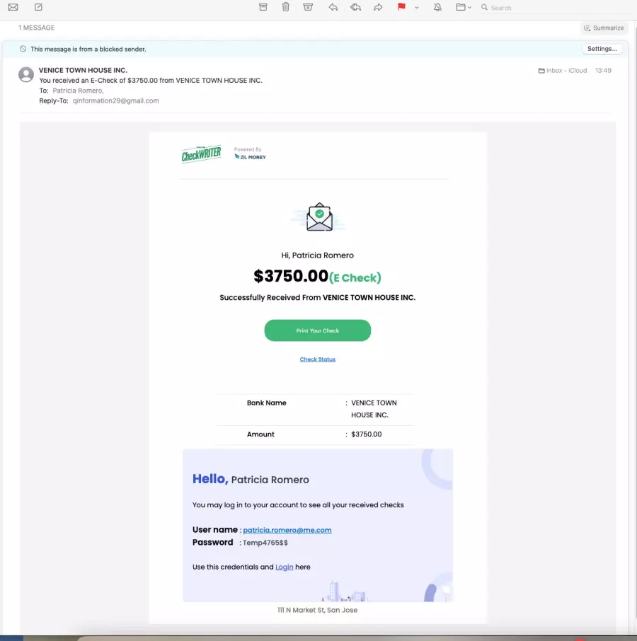 After the whole process was done and questions answered, he told me I got the job and asked for 3 references to send them via email at [email protected], and like other's, told me that he would be sending me a check for the price of software to be loaded and that all equipment would be provided. I should have known that legitimate companies DO NOT use @gmail or yahoo or live or hotmail.