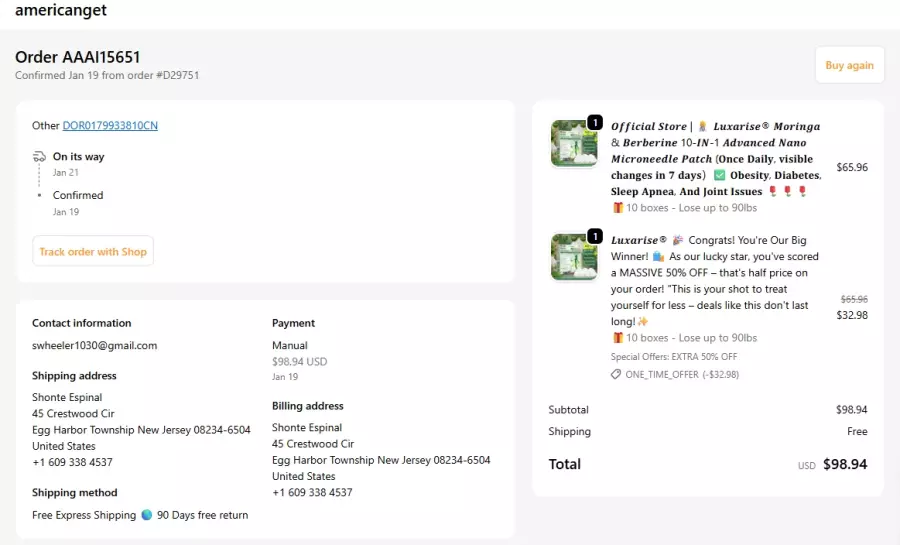 The most strangest thing, is the receipt that I received when they sent their confirmation for my order showed I ordered the 10 boxes of Moringa & Berberine for $65.96 and then another order shows underneath saying Congratulations, You're the big winner for 50% off and another box was placed on my order adding an additional $32.98 - so this total came to $98.94 which does not match what I was billed for on my PayPal. Very bad business or they are scammers.