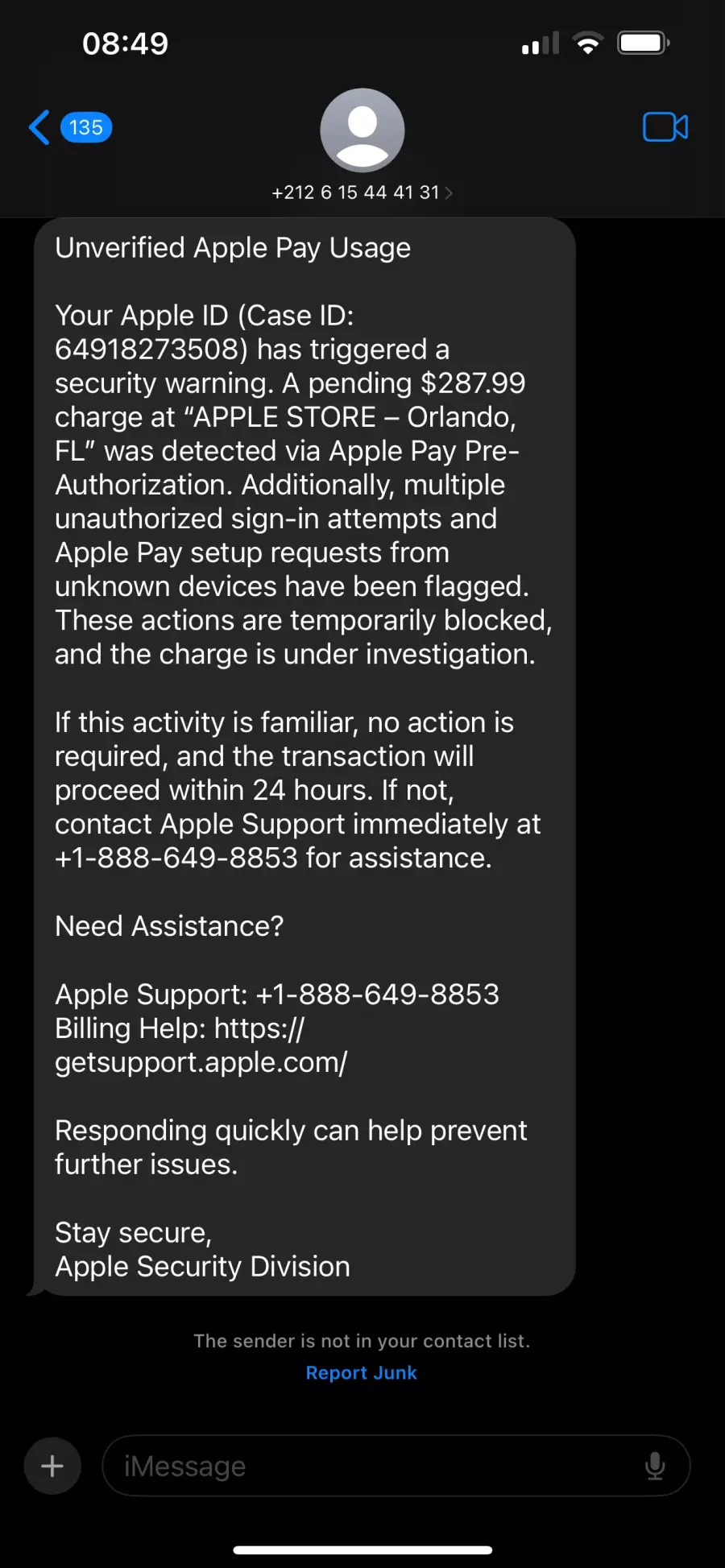 Your Apple ID (Case ID: 64918273508) has triggered a security warning. A pending $287.99 charge at “APPLE STORE – Orlando, FL” was detected via Apple Pay Pre-Authorization. Additionally, multiple unauthorized sign-in attempts and Apple Pay setup requests from unknown devices have been flagged. These actions are temporarily blocked, and the charge is under investigation.