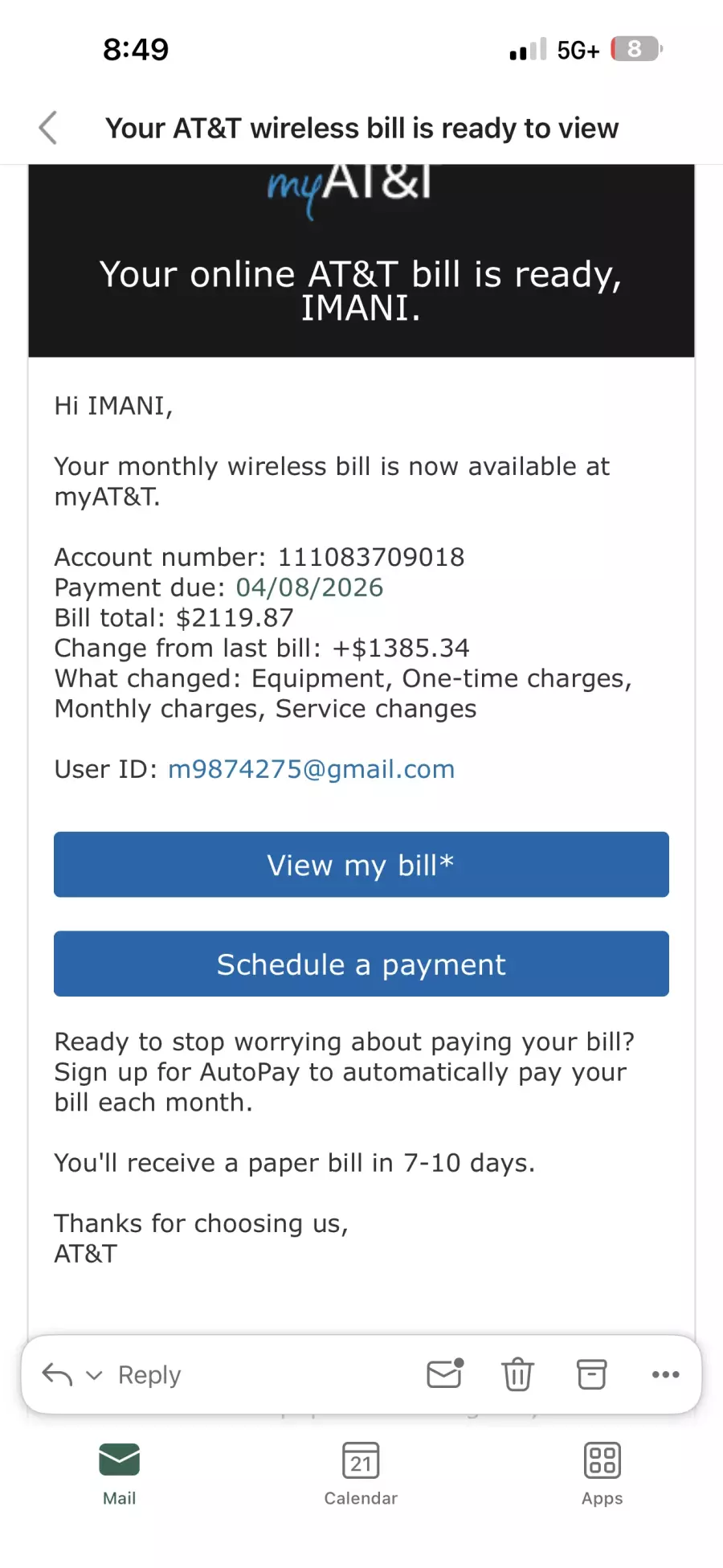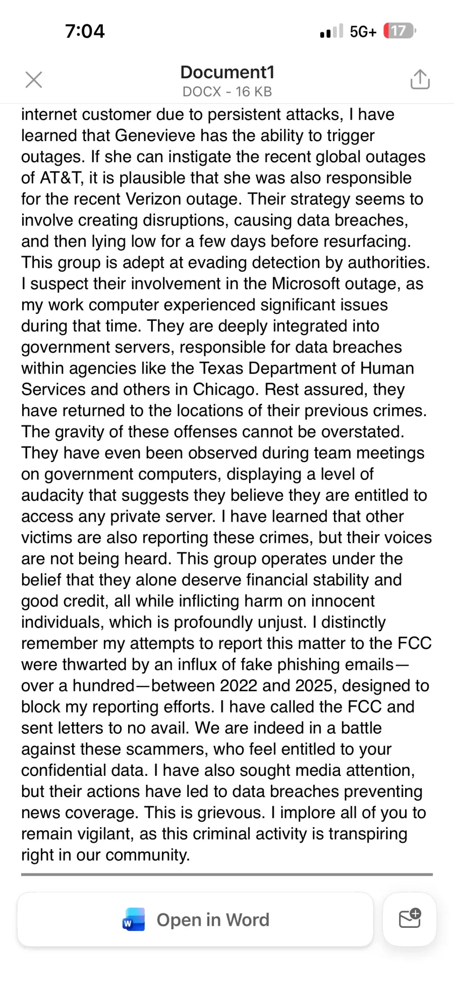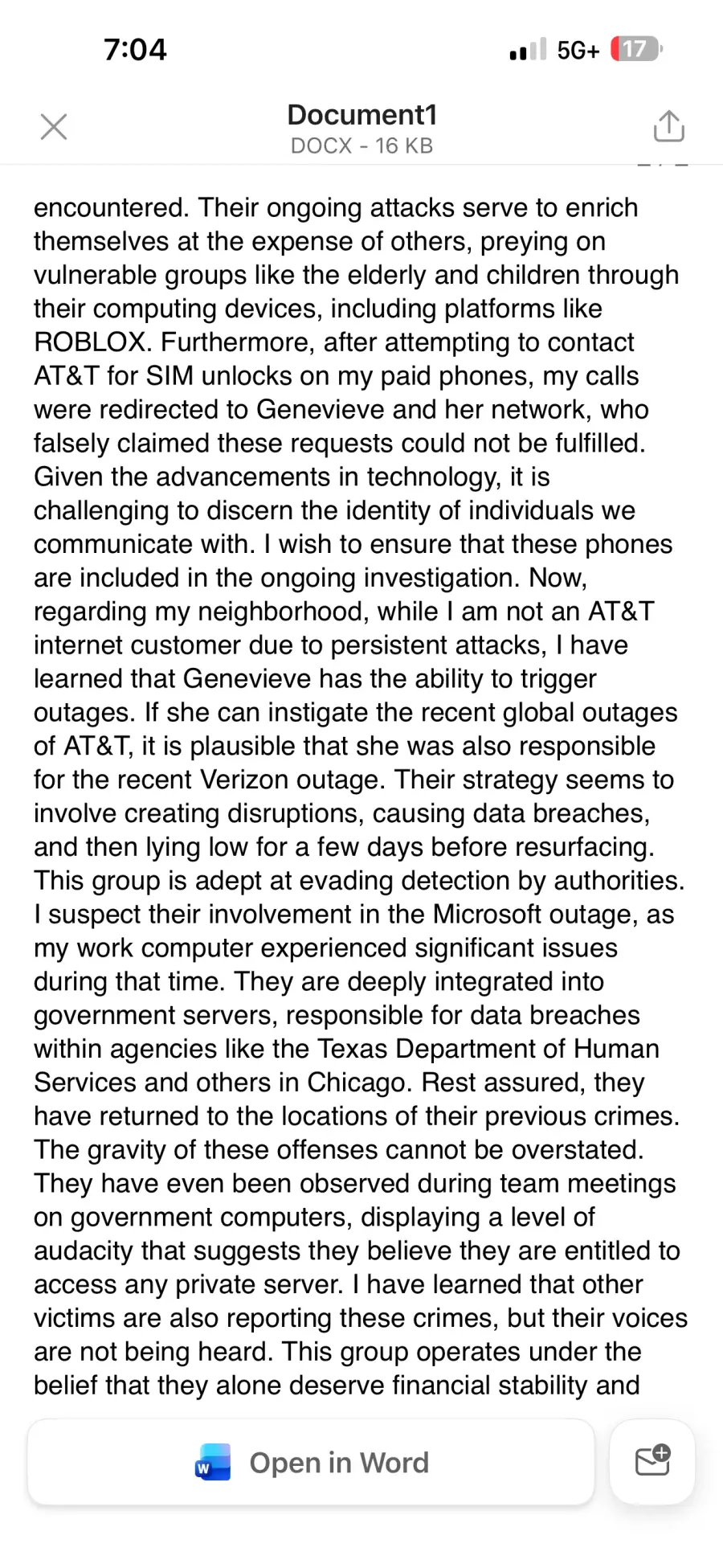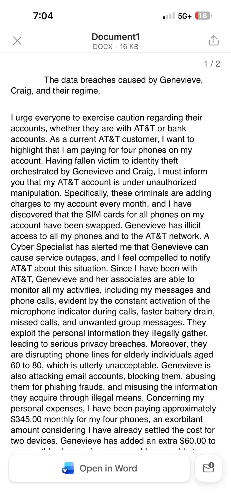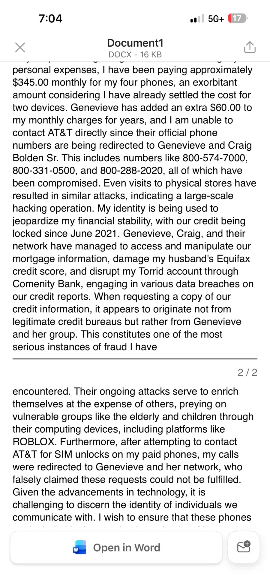 Approximately 10 minutes later received a text message asking for copies of personal identification documents. We again declined and contacted AT&T customer service to verify it was not them in truth.
