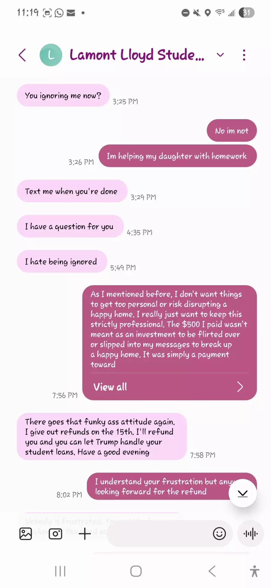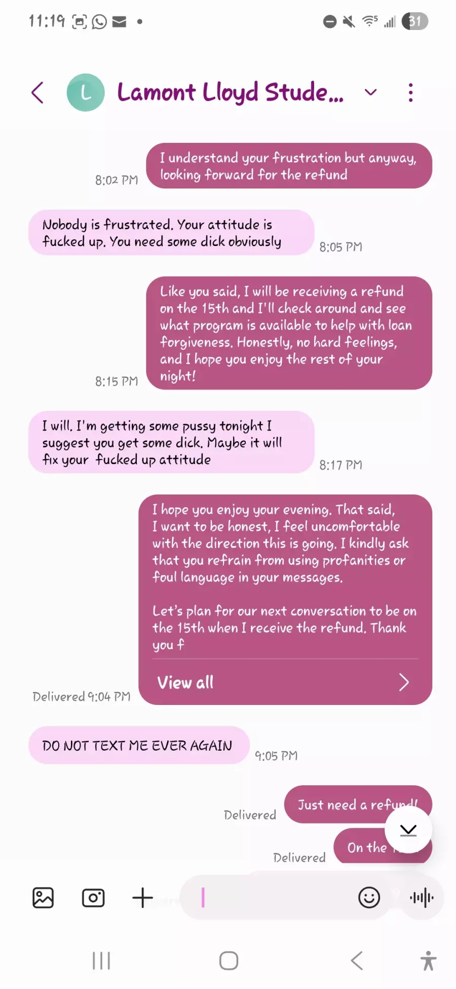 Lamont promised that he could have the student loans forgiven in 2022 and I gave him a shot he promised that he would give a refund at the 1st of the month if the student loan wasn't forgiven. (I know I know I should have been smarter I'm kicking myself because I should have trusted my gut but gave the benefit of the doubt)