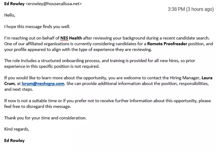 Suspicious job interview and fake check scam from Neshcg.com