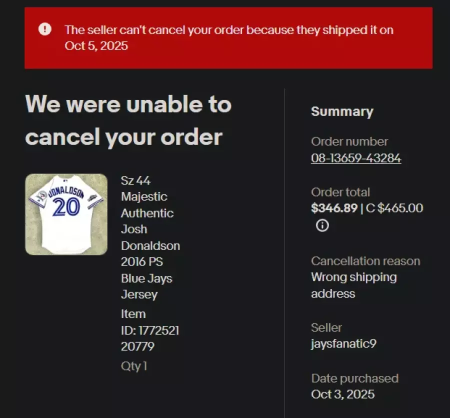 The jersey arrived a few days later and it was the wrong size. I messaged him on Instagram about the error and learned he'd blocked me. My girlfriend messaged him mentioning I was trying to get a hold of him, and he blocked her too. He hasn't responded to any of my messages on Kijiji or eBay.