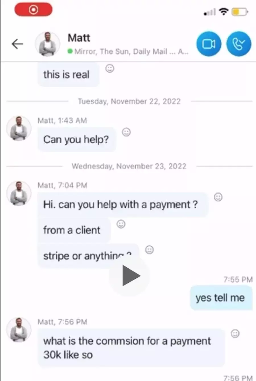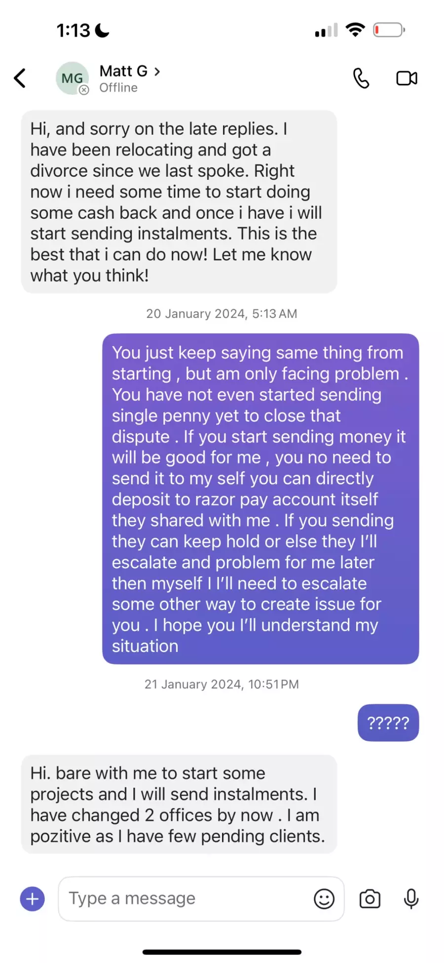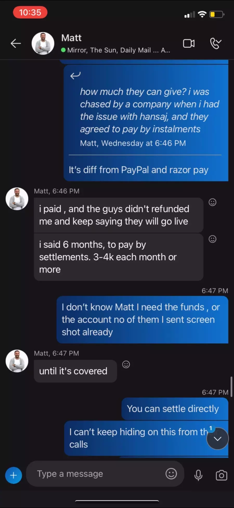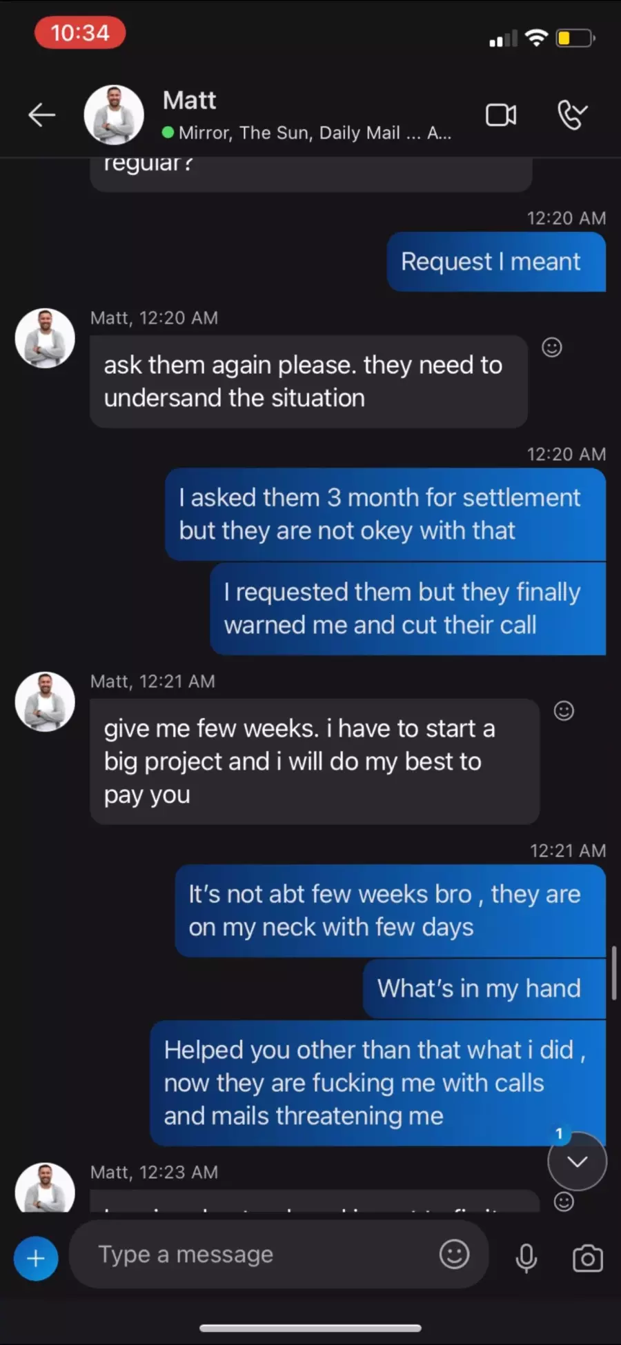 Admissions of Debt: I possess forensic screen recordings of Skype and Team communications where Matei Gavriluta explicitly acknowledged receipt of the funds and repeatedly promised to repay the amount in installments.