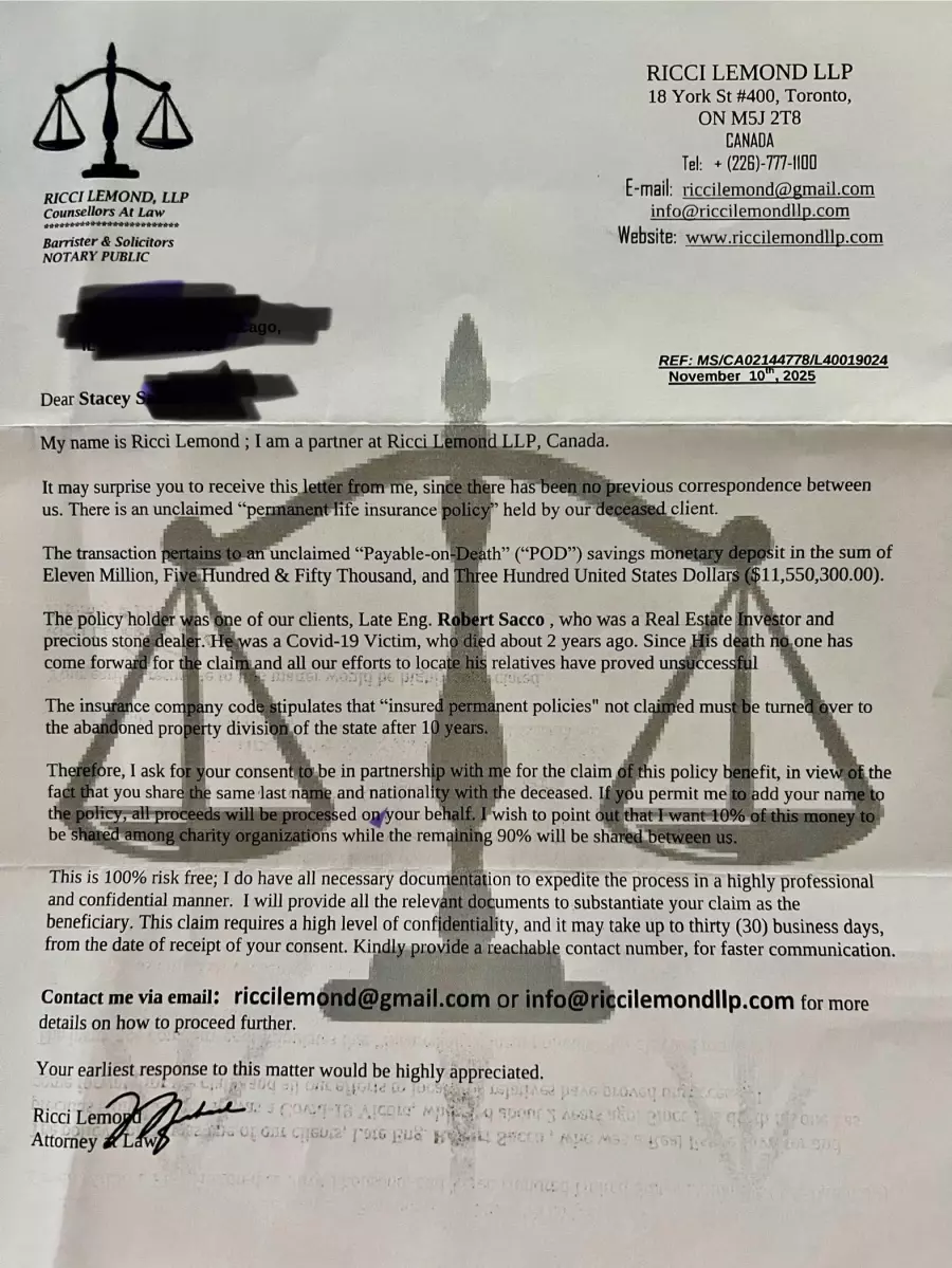 Received a letter about a death benefit scam from Ricci Lemond.
