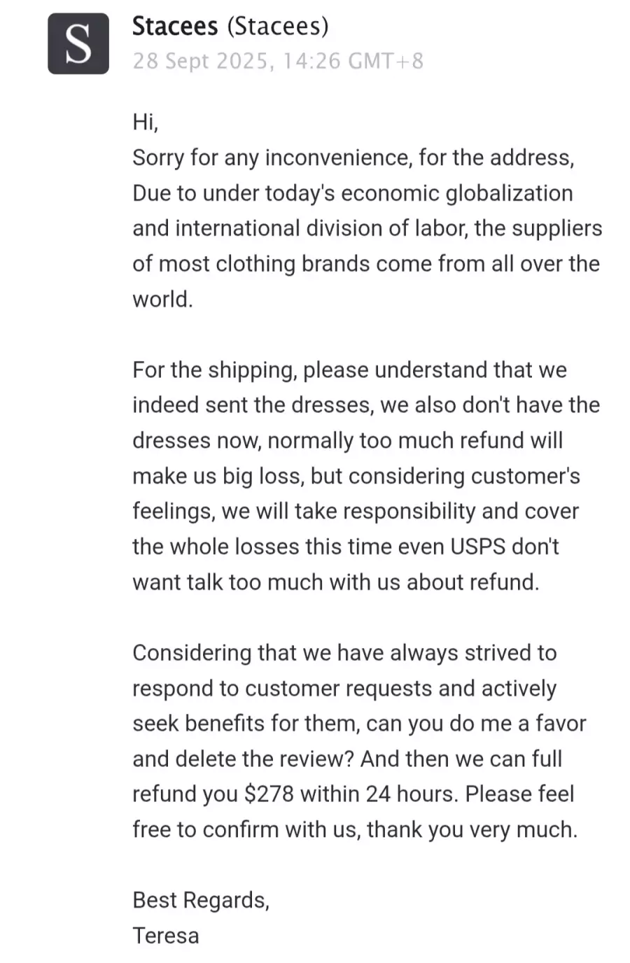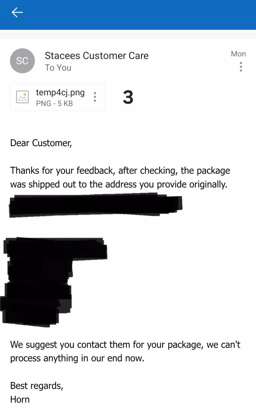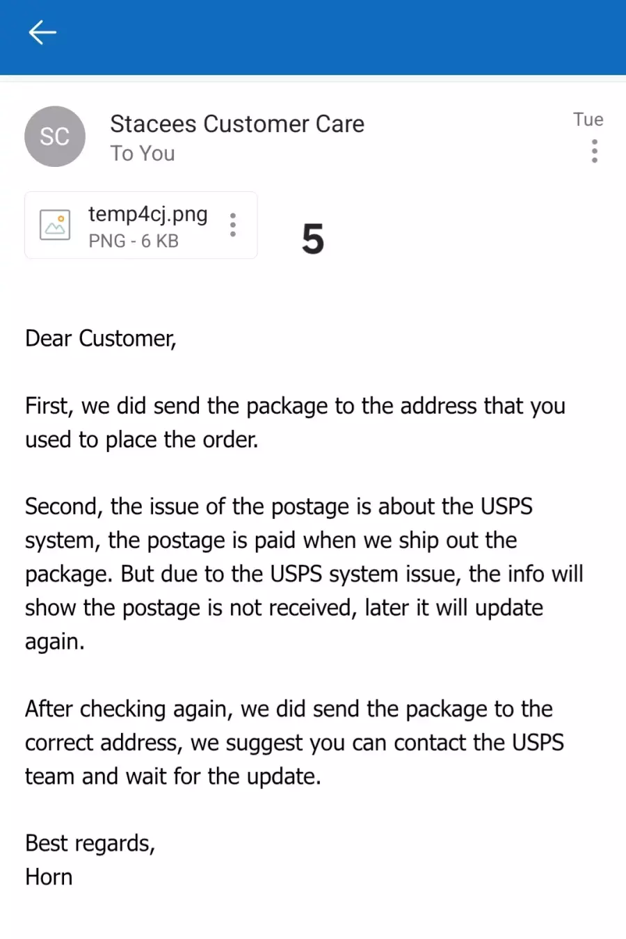 5) Due to the wrong postage, weight, and the fact that the tracking information and barcode information did not match, the package was flagged as a scam, so it was sent to the Mail Recovery Center and I will never get it back. Stacees has responded to all of my emails with bot-like unprofessional responses. They blackmailed me to delete my negative reviews or they wouldn't give me my money back.