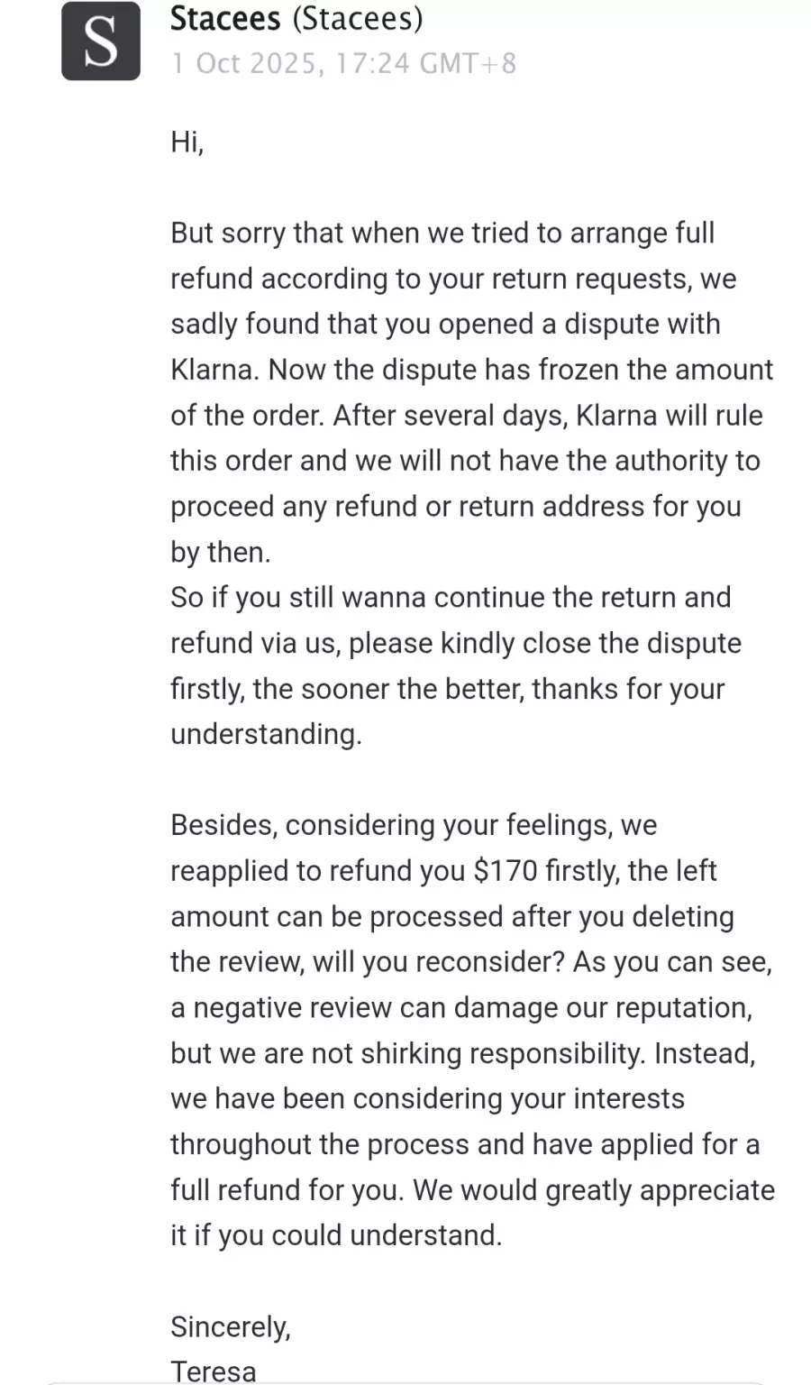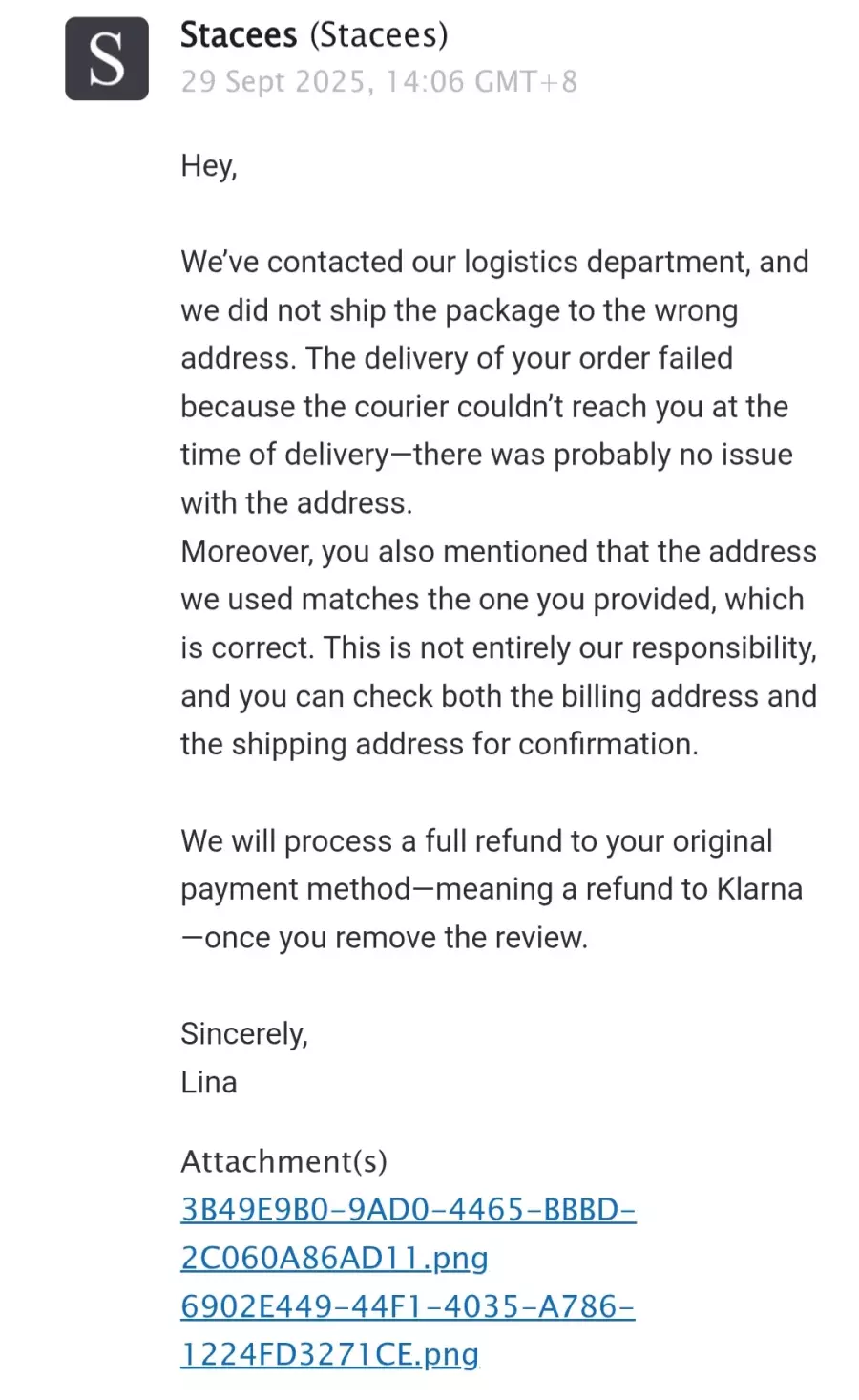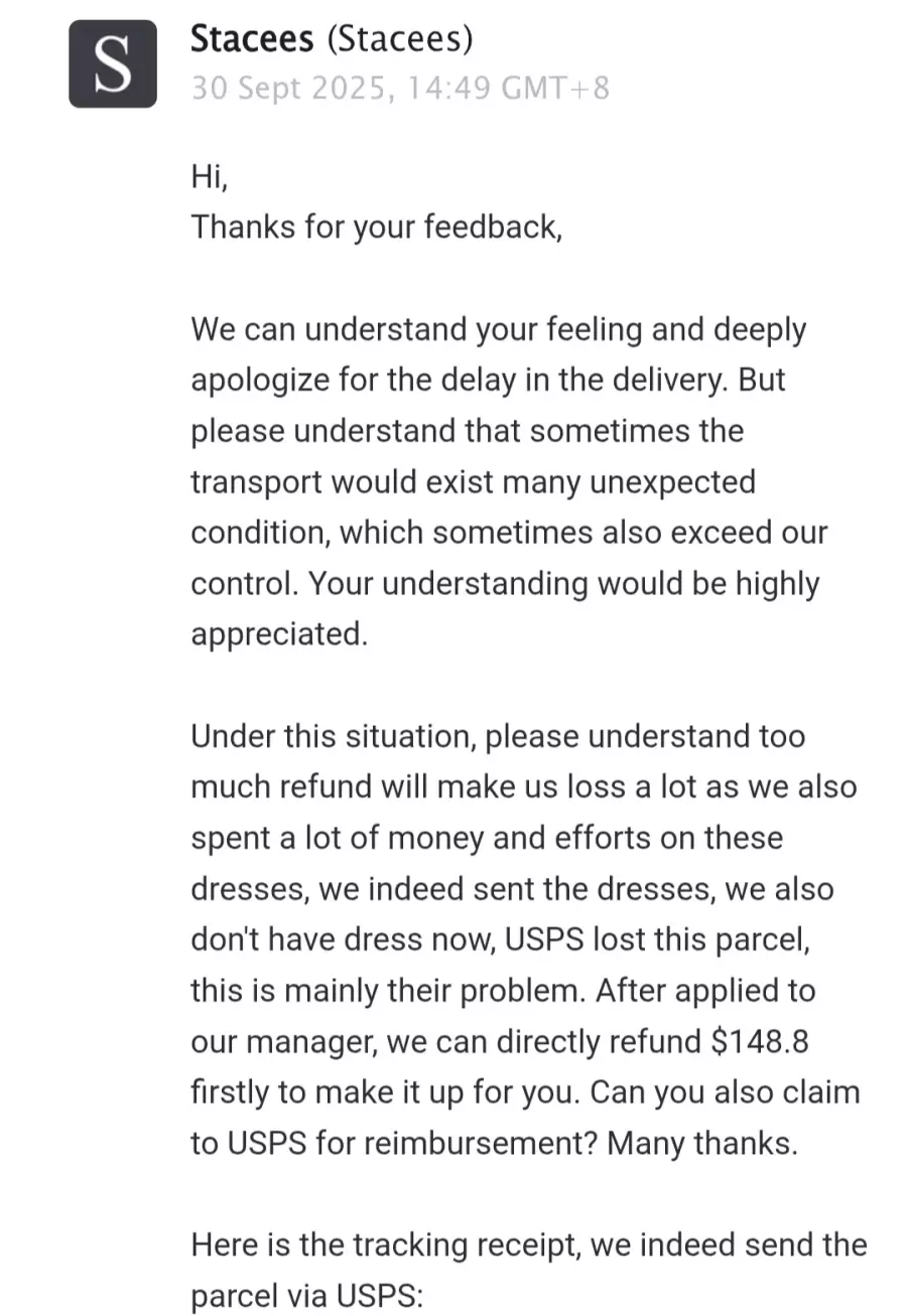 5) Due to the wrong postage, weight, and the fact that the tracking information and barcode information did not match, the package was flagged as a scam, so it was sent to the Mail Recovery Center and I will never get it back. Stacees has responded to all of my emails with bot-like unprofessional responses. They blackmailed me to delete my negative reviews or they wouldn't give me my money back.