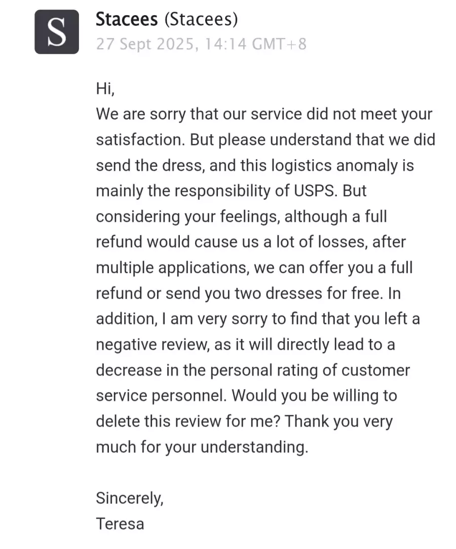 "Please allow me to share my idea first, thanks for your time. The returning shipping fee is paid by the customer and as you know, the delivery is unstable. Considering that you need pay extra cost, time and energy, we hope to provide you a better solution, so I have applied our manager to refund you $10 and you keep the dress directly. You can resell it for a profit.