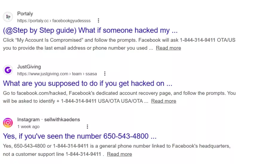 I am writing to report a scam related to a fake Facebook help page. I was searching online for assistance regarding a Facebook account issue and found a page titled (@Step by Step guide) What if someone hacked my ...The page displayed a support number 844-314-9411, claiming to provide Facebook assistance. When I called the number, the person on the line pretended to be a Facebook support representative and guided me through several steps. They asked for personal information and attempted to gain access to my account. After the interaction, I realized this was not legitimate Facebook support but a scam attempt. Please investigate this number and take appropriate action to prevent others from being targeted.
