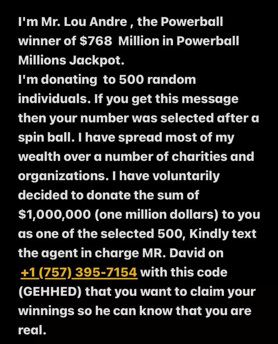 This message is to inform you that you’ve been selected as one of 200 random individuals to receive a donation of $1,000,000 from Mr. Lou Andre, winner of the $768 Million Powerball Jackpot.