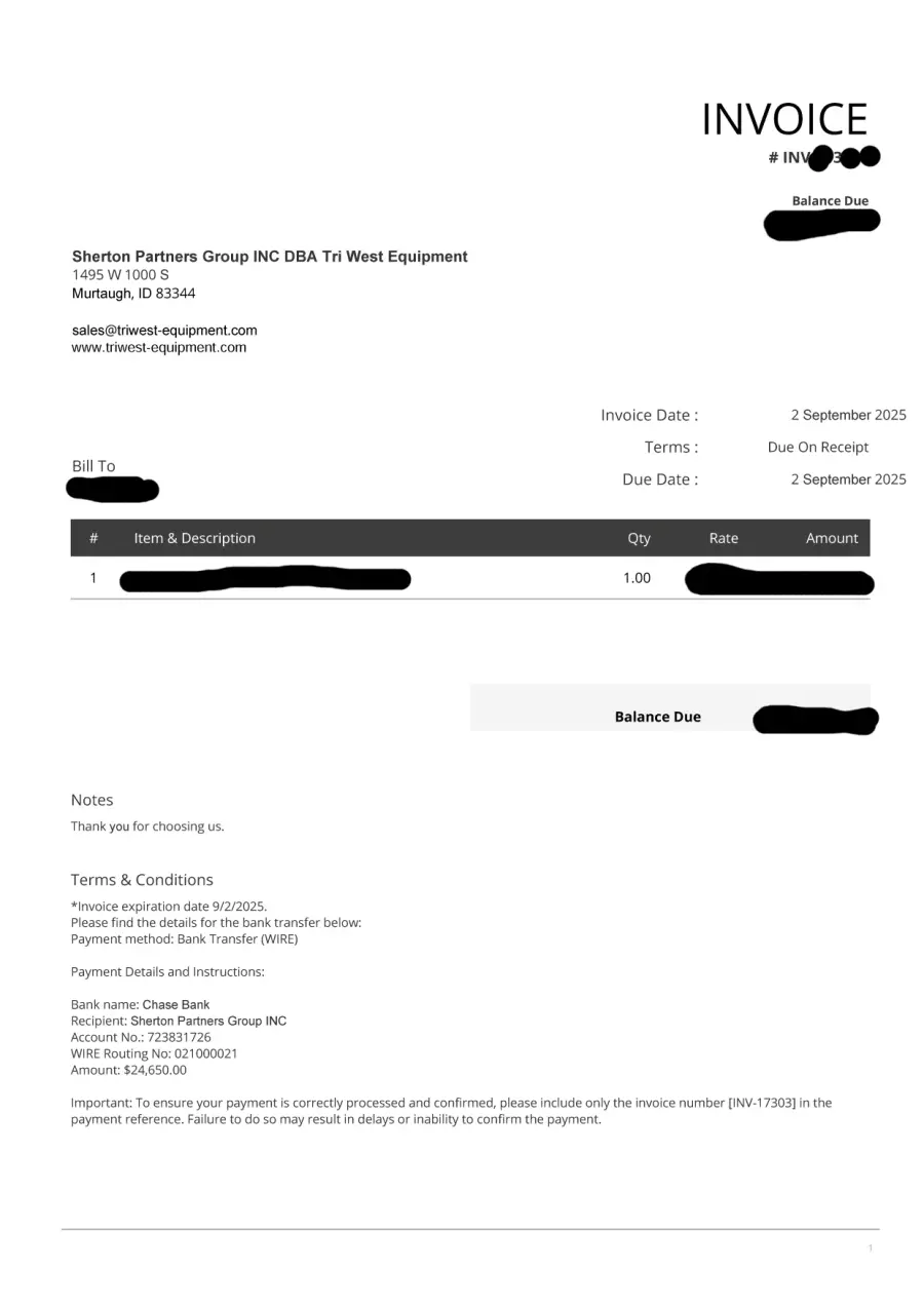 Do your research people look up company names on the Internet before you wire any money I'm going after her and God help her if I find her! Her website is https://triwest-equipment.com But who knows who Tri-West Equipment will be called next week.