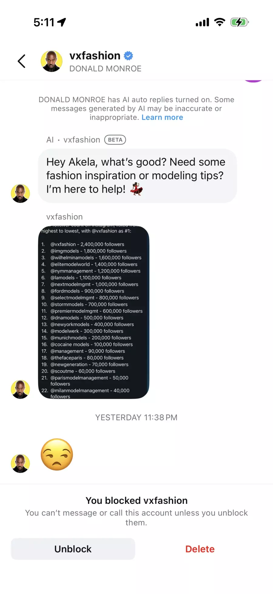 Due to the nature of his behavior, I felt uncomfortable and ultimately blocked him across all platforms.