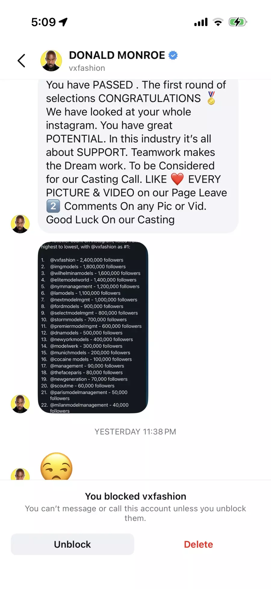 I am concerned that this individual may be targeting aspiring models and using high-pressure tactics, misrepresentation, and intimidation to solicit money. I believe this behavior is inappropriate and potentially exploitative.